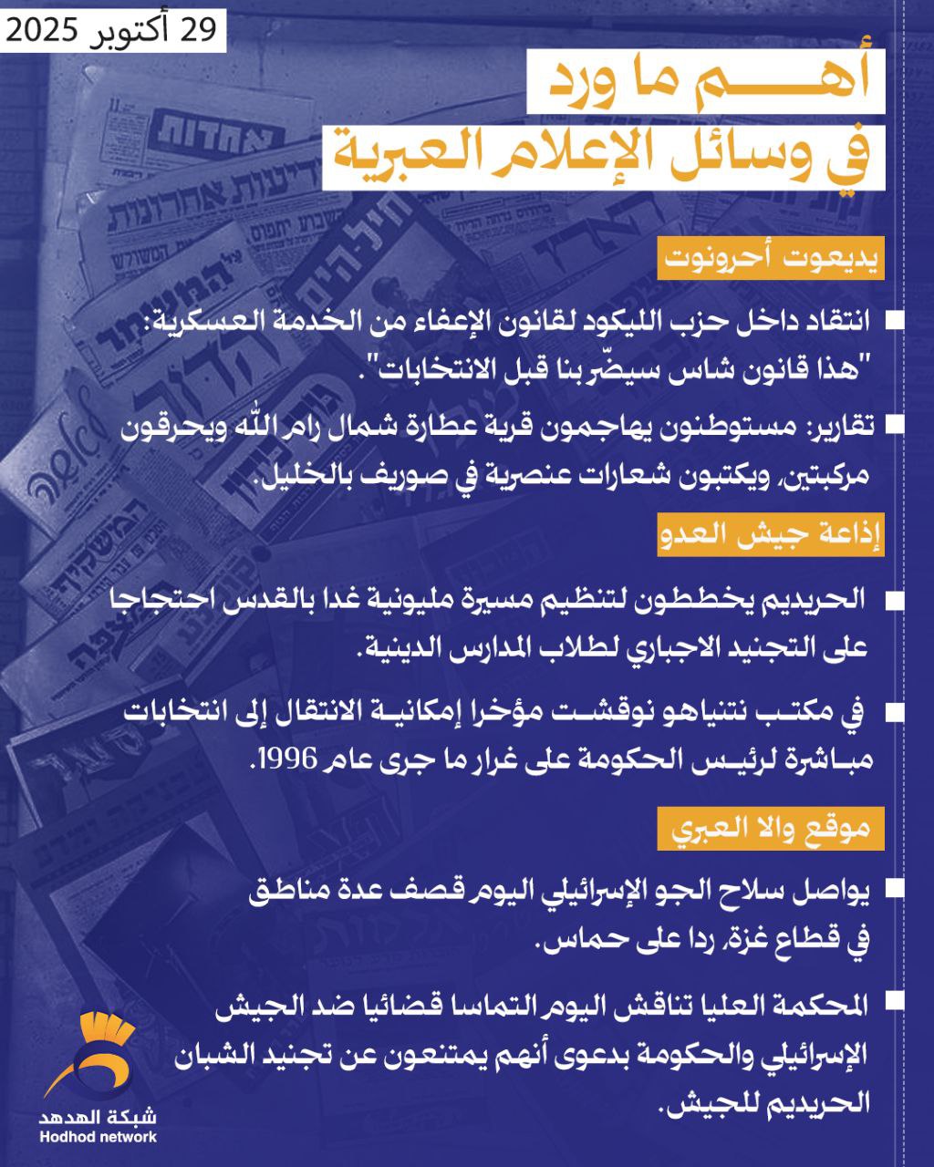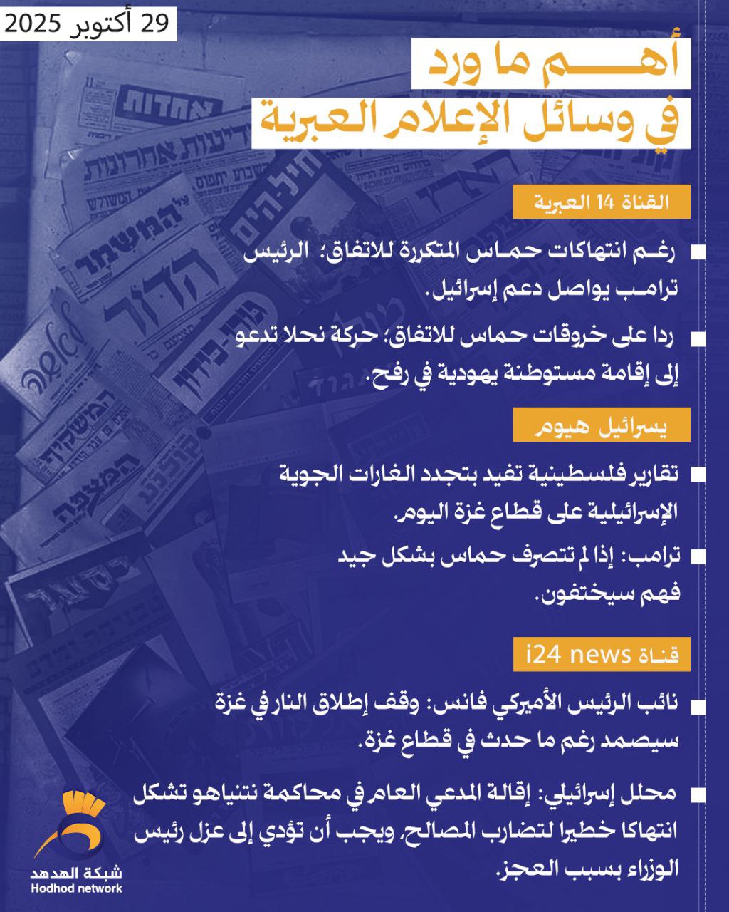 أبرز العناوين بوسائل الإعلام العبرية صباح اليوم الأربعاء 29/أكتوبر/2025 أخبار رئيسية 29 أكتوبر 2025 كلمات دلالية الحرب الإعلام العبري غارات مقتل جندي غزة