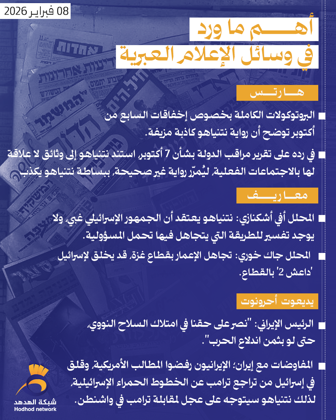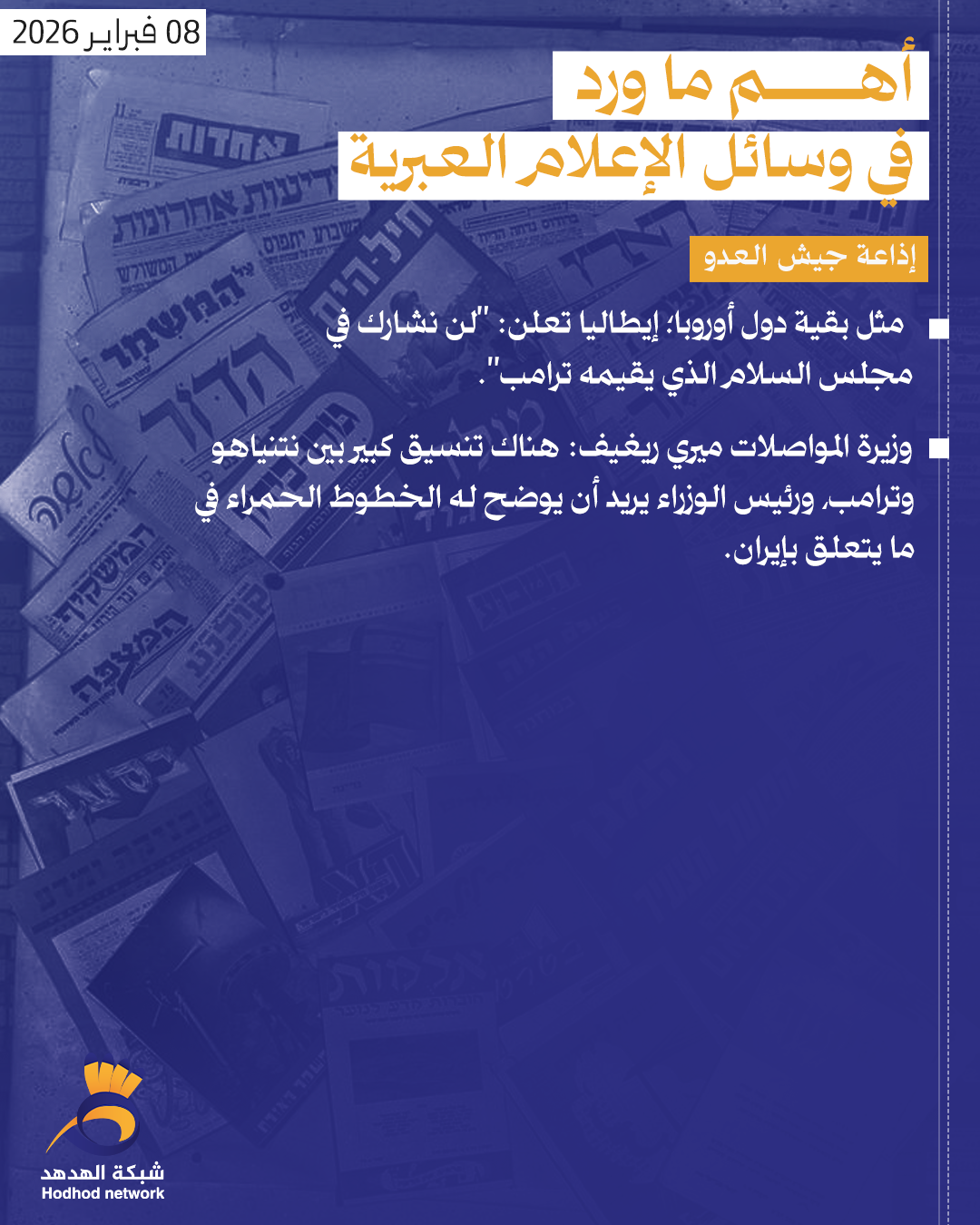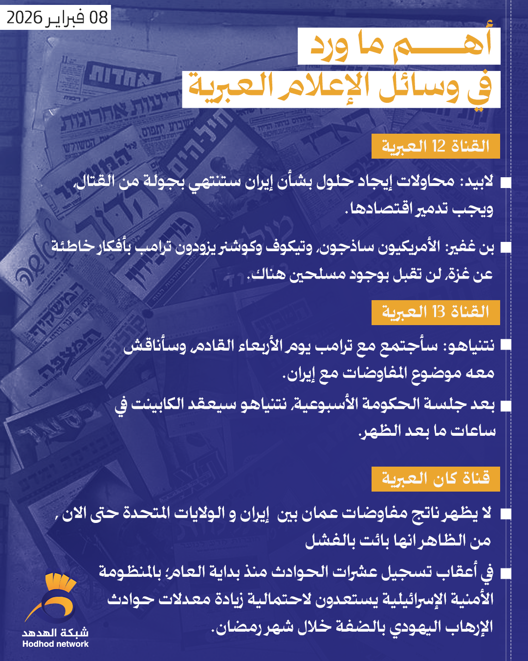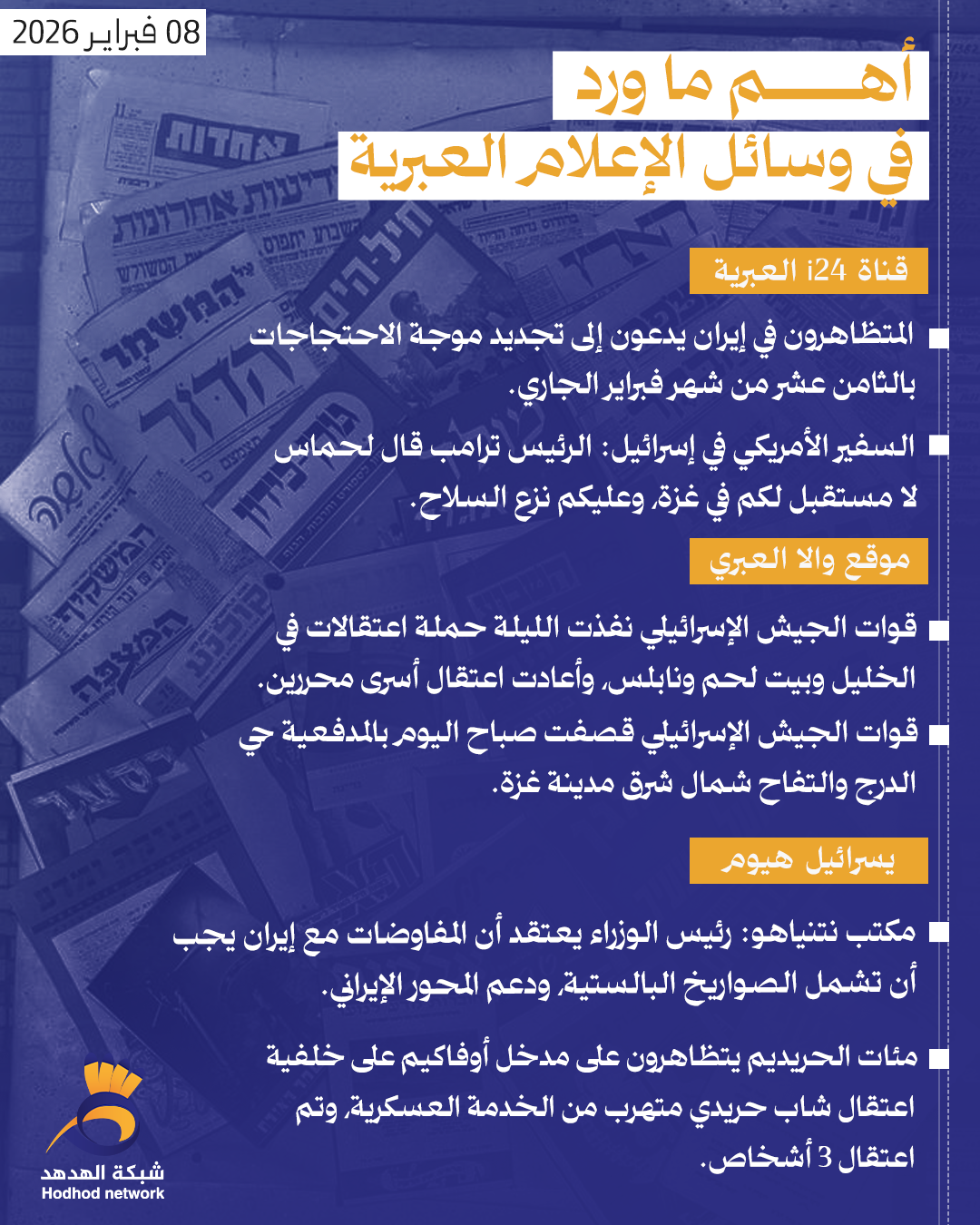 أهم ما ورد في وسائل الإعلام العبرية صباح اليوم الاحد أخبار رئيسية 8 فبراير 2026 كلمات دلالية الإعلام العبري وسائل الإعلام العبرية