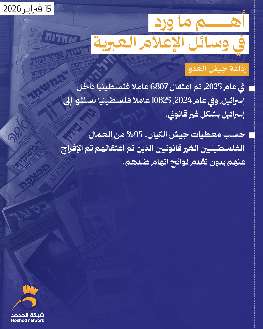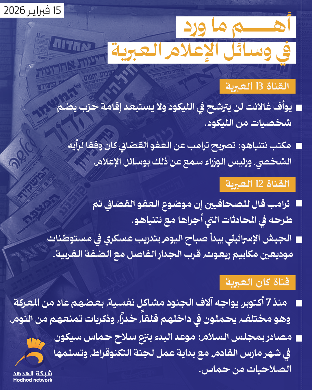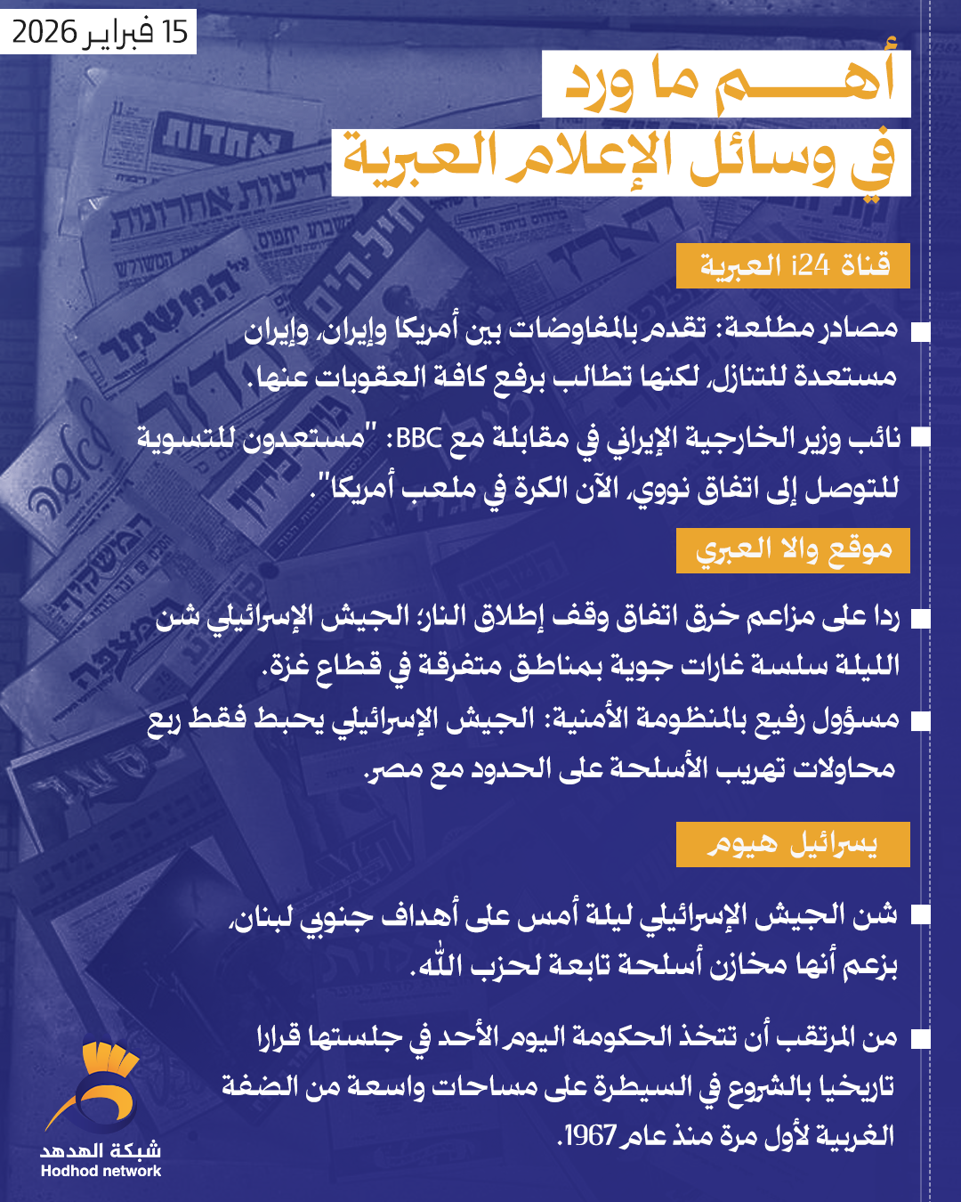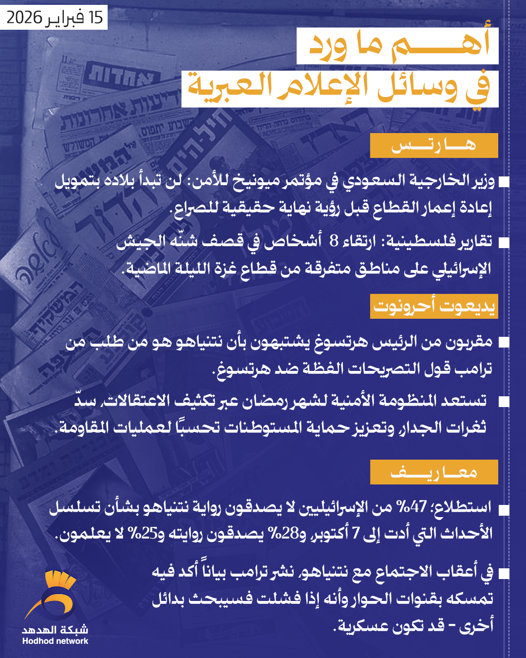 أهم ما ورد في وسائل الإعلام العبرية صباح اليوم الاحد أخبار رئيسية 15 فبراير 2026 كلمات دلالية وسائل الإعلام العبرية