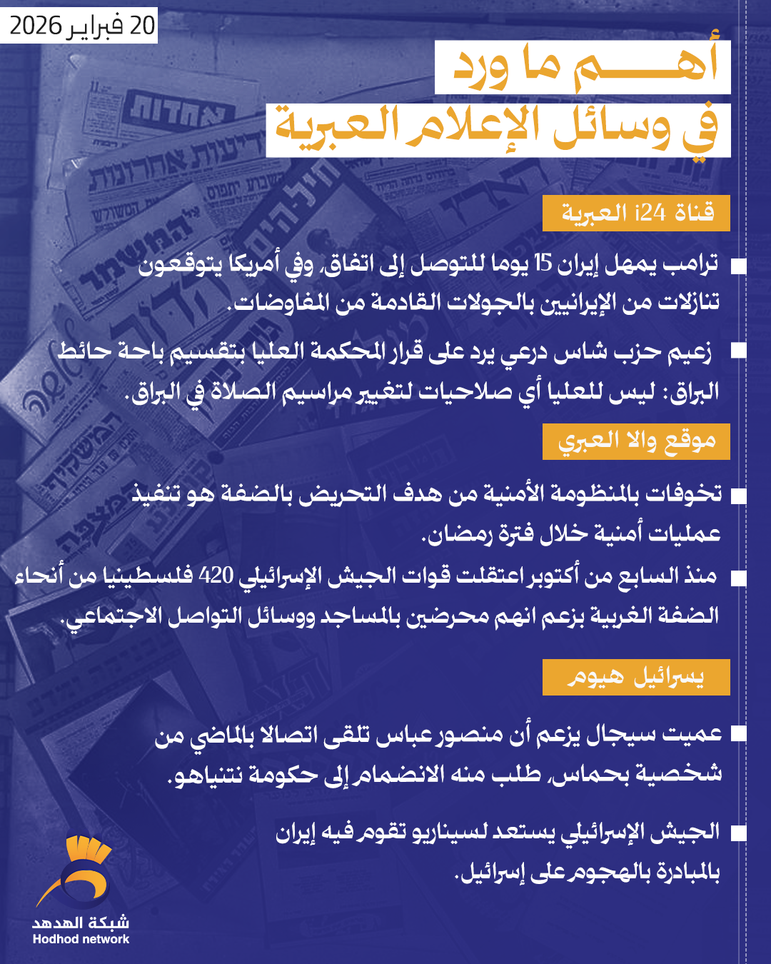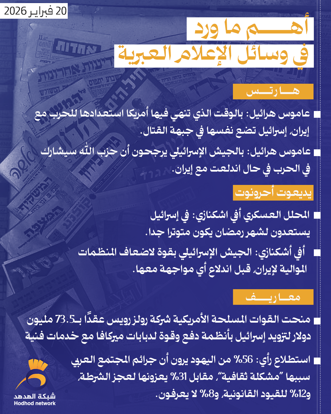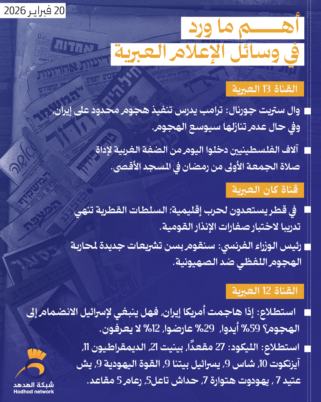 أهم ما ورد في وسائل الإعلام العبرية صباح اليوم الجمعة أخبار رئيسية 20 فبراير 2026 كلمات دلالية وسائل الإعلام العبرية