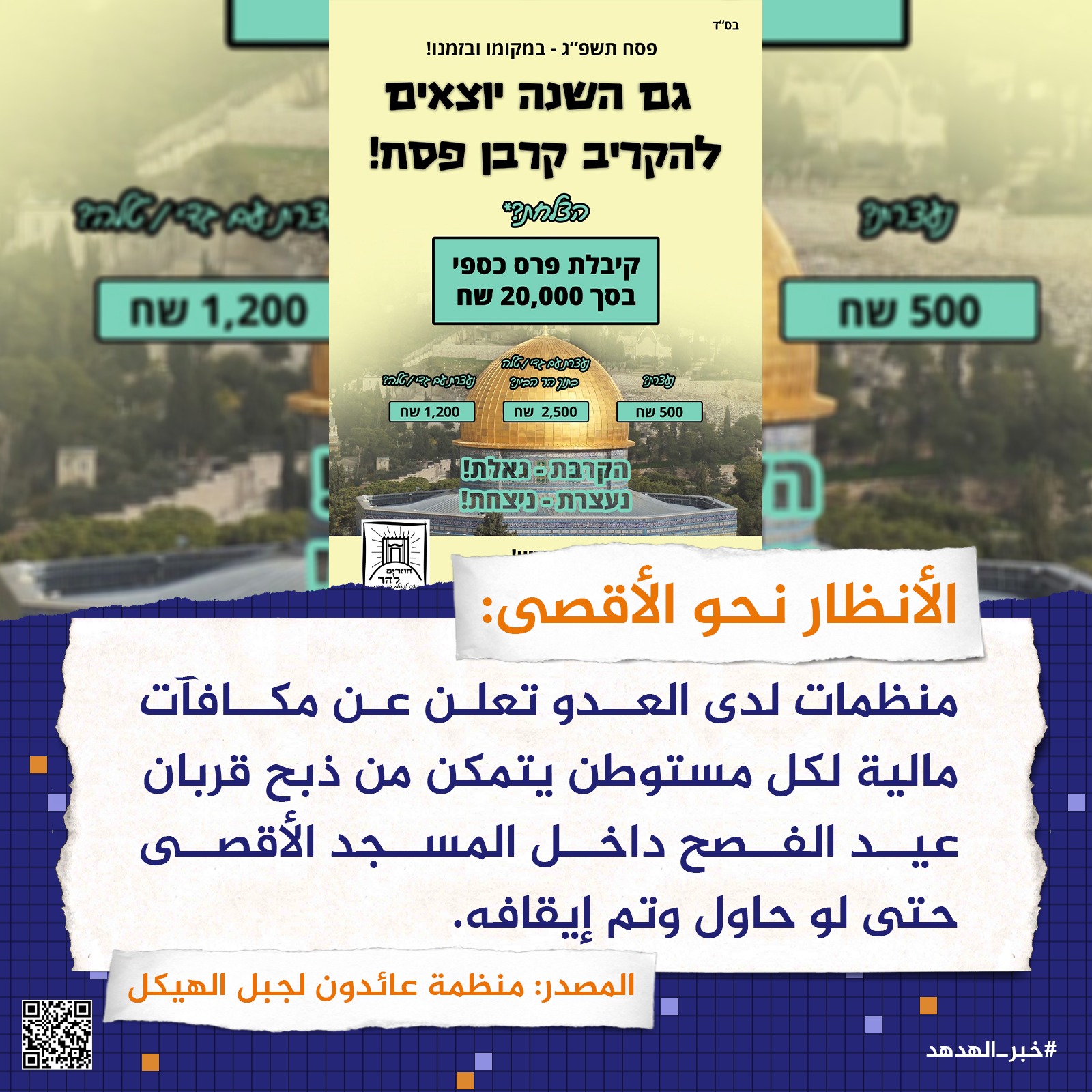 أرسل 15 حاخاماً رسالة إلى "نتنياهو"، ووزير الأمن القومي للعدو "إيتمار بن غفير"، طالبوا من خلالها السماح للمستوطنين بذبح قرابين "عيد البيسح" لهذا العام في المسجد الأقصى.