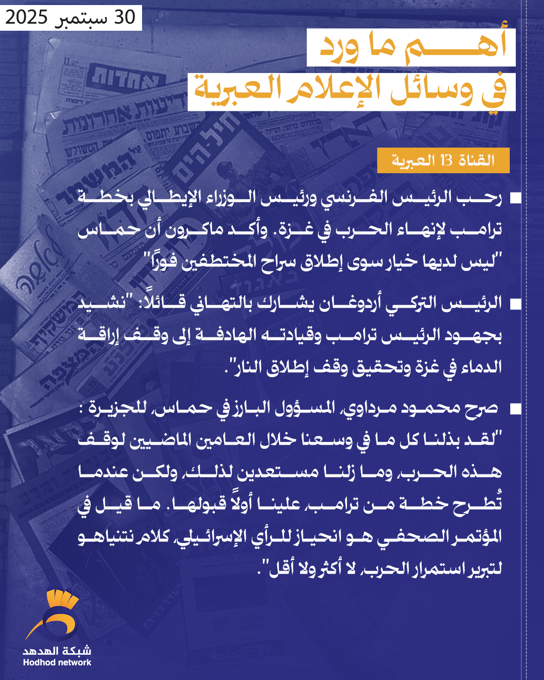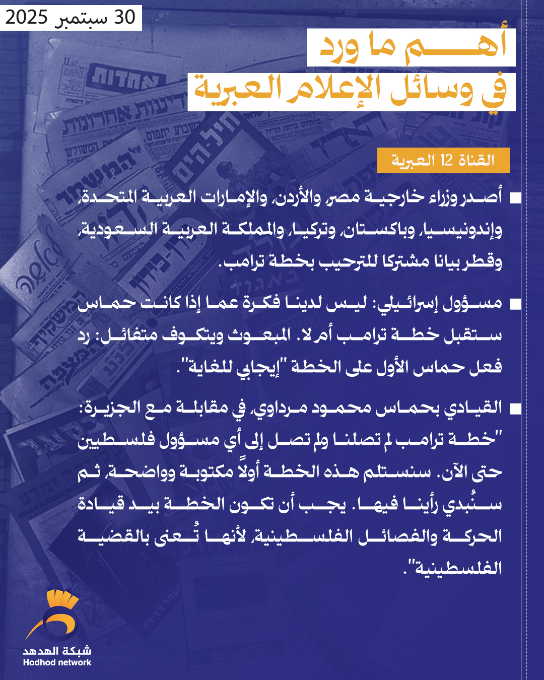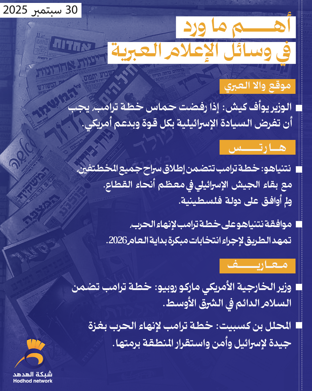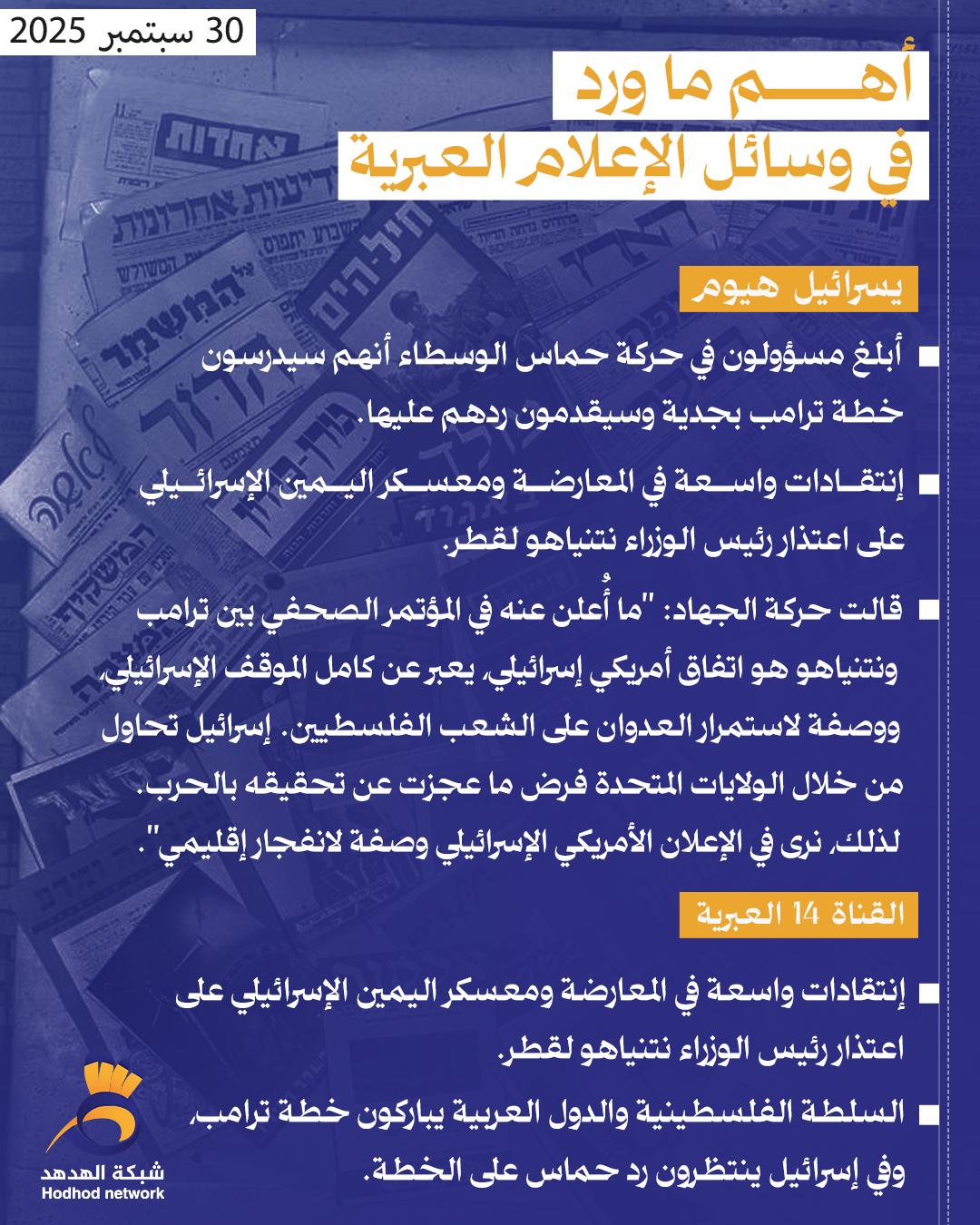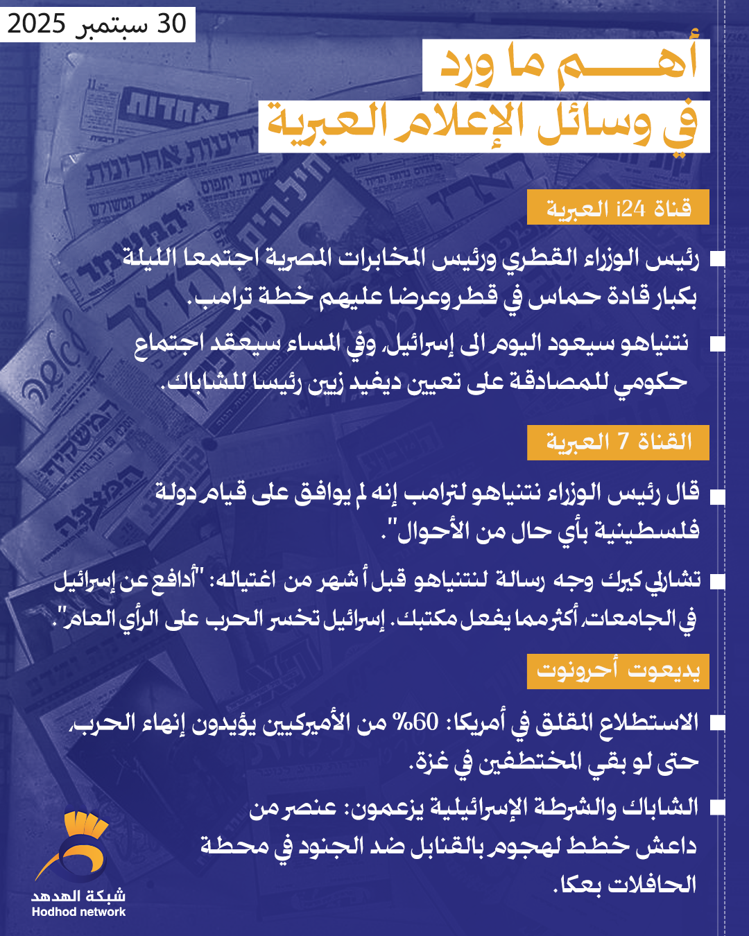 أبرز العناوين بوسائل الإعلام العبرية صباح اليوم الثلاثاء 30/سبتمبر/2025 admin أخبار رئيسية 30 سبتمبر 2025 أبرز العناوين بوسائل الإعلام العبرية صباح اليوم الثلاثاء 30/سبتمبر/2025 كلمات دلالية العناوين